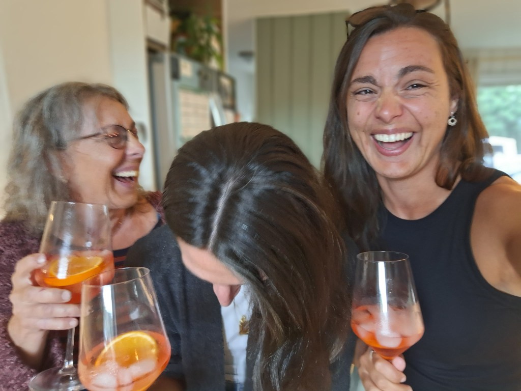 We all gathered at their house, which she and her partner have remodeled into something out of a design magazine: clean lines, cozy corners, sunlight spilling across every room. We wasted no time popping open the Aperol and prosecco, clinking glasses of spritz that glowed like orange sunsets. The grill never got a break: skewers sizzling, vegetables charring, someone always sneaking “just one more” piece of bread off the cutting board.