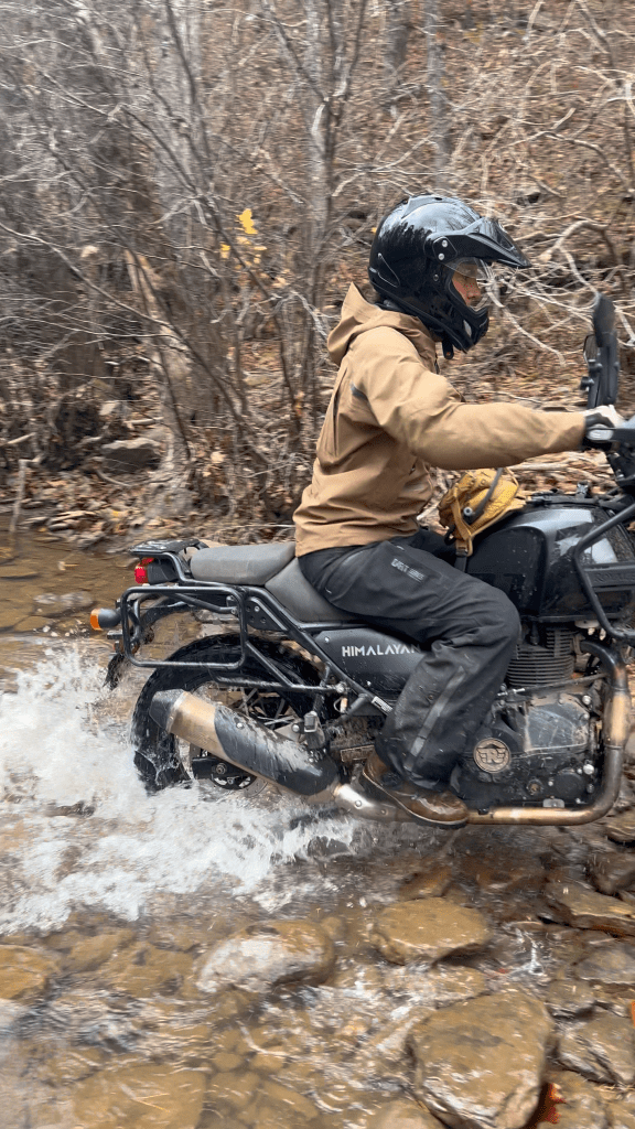 Chris sails up a steep incline with ease. I follow, unaware that I’m in third gear instead of first. I try to power my way up, stall, and wipe out sideways into the washed-out trail. Everything’s fine, I say over the comms, as Chris rushes back to help me right the bike. We push on.